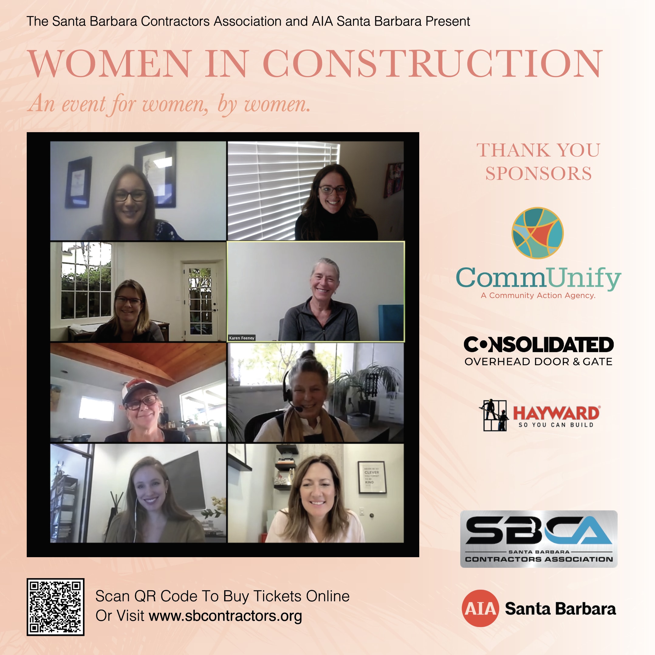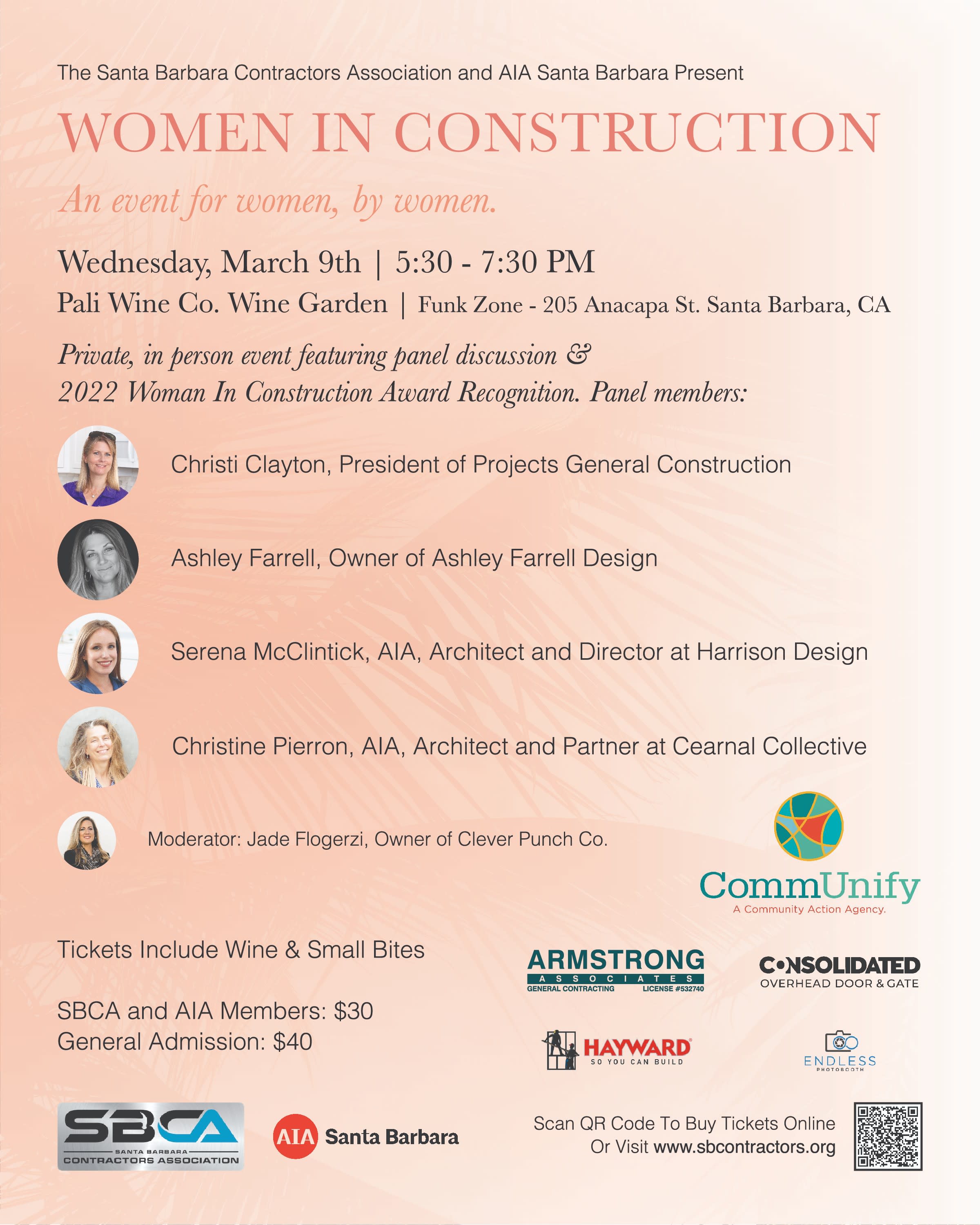 An event by women, for women in the construction industry. Featuring a panel discussion from members in our Santa Barbara building community and the 2022 Woman In Construction Award Recipient Recognition.